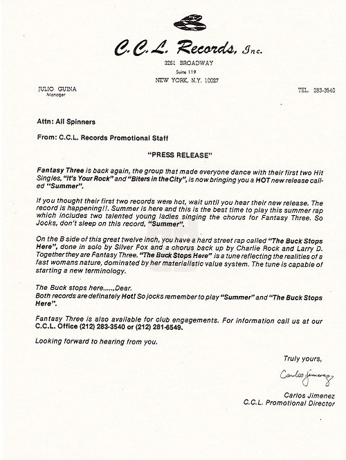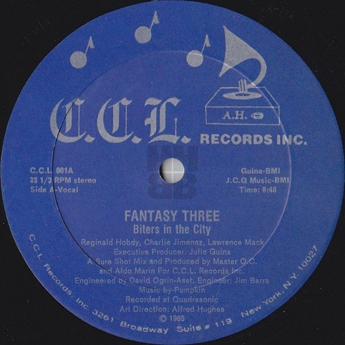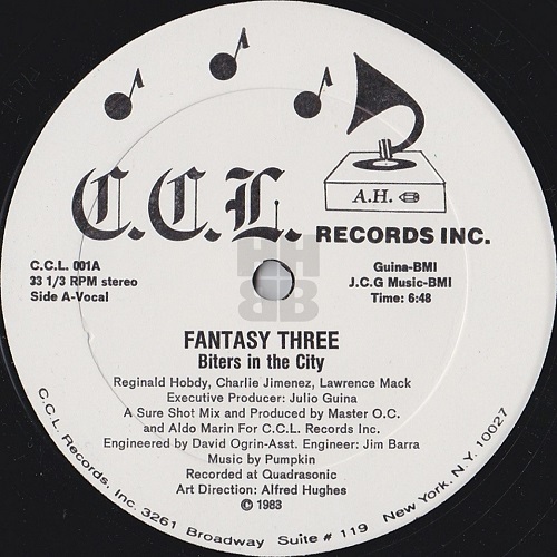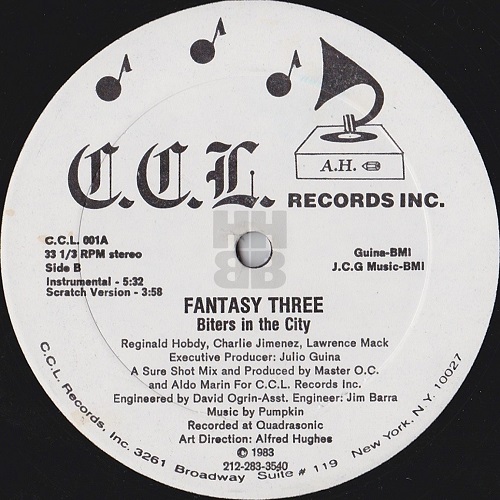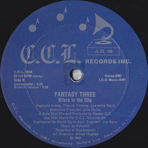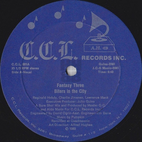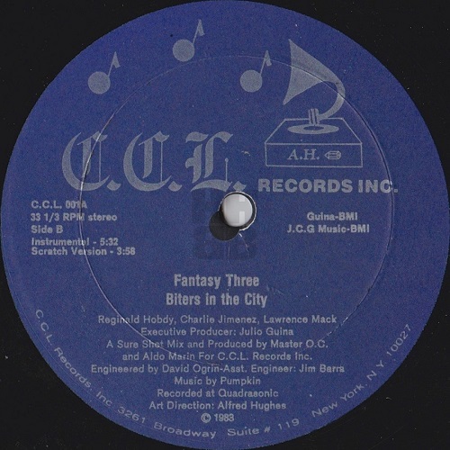 Chico, Charlie and Larry joined forces to form C.C.L. Records and release Fantasy Three’s second track, Biters In The City, a direct diss to the Crash Crew. Once again, music was by Pumpkin and the mix was by Master O.C. with some added input from Aldo Marin (Cutting Records). The track was also engineered by another unsung hip hop hero whose name appears on many releases, Dave Ogrin.