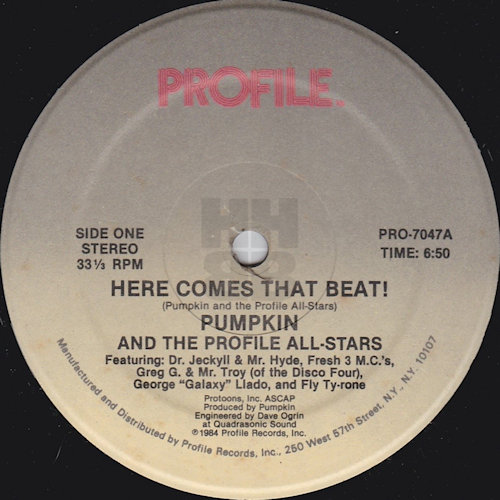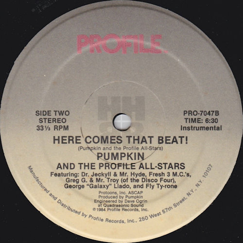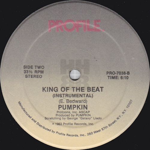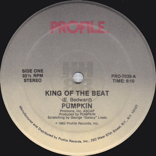 King Of The Beats was his debut release as an artist and featured scratching by Scratch On Galaxy aka DJ Galaxy (George Llado). This was followed by the classic, Here Comes That Beat! which featured fellow Profile artists, Dr, Jeckyll & Mr. Hyde and Greg G & Mr. Troy of The Disco Four plus Fly Ty-rone, who only seems to appear on this release, together with Scratch On Galaxy once again. The track was engineered by Dave Ogrin, who provided some additional information regarding Pumpkin…