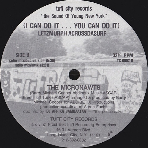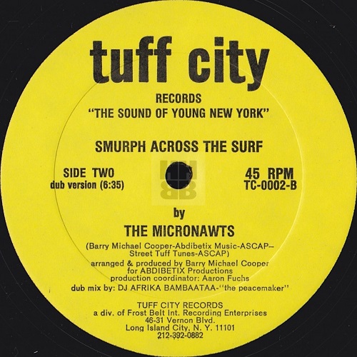 Barry Michael Cooper first appeared on Express Records in 1981 when he wrote and produced the track What Time? using the recording name Teletron. He followed that in 1982 when he produced Maximus Three’s Rock It Out, before joining forces with Aaron Fuchs to produced Tuff City‘s debut release, Beach Boy by Verticle Lines which also featured legendary graffiti artist, Phase 2. In the same year he went on to produce an electro classic, Smurph Across The Surf, using the recording name, The Micronawts, which featured some additional production from Afrika Bambaataa.