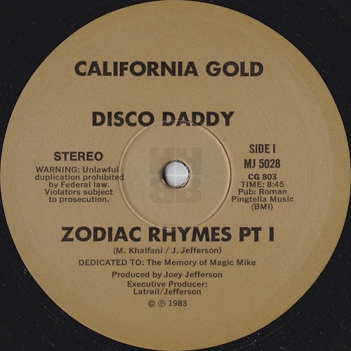 Threatened with their track being credited to a fictitious artist resulting in no royalties being paid, Disco Daddy had no choice but to sign with the label and went on to record Zodiac Rhymes, a track dedicated to his friend Magic Mike, which was released a couple of years later. Unfortunately the label went ahead and released The Gigolo Rapp anyway under the name Captain Crunch & The Funky Bunch and slightly retitled, The Gigolo Groove, which prevented the duo from receiving any royalties or money from touring.